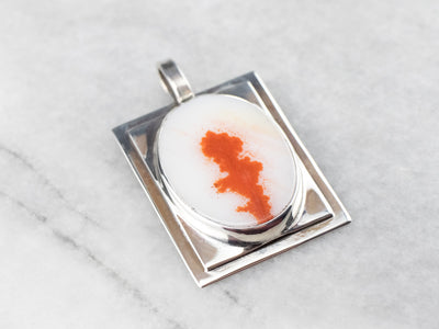 Stunning and ghostly, this is a firey piece of dendritic agate! The stone is a unique white and orange-hued agate that has a cool translucent look with a lot of depth. Absolutely breathtaking, this minimalist rectangle sterling silver pendant is perfect to gift!