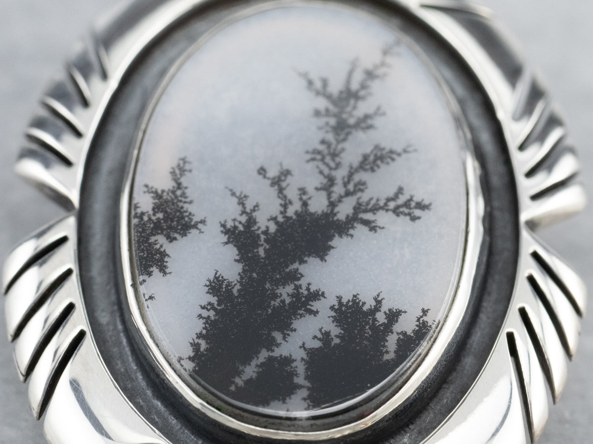 This is a ghostly cabochon set into a unisex tribal style sterling silver setting creating an absolutely breathtaking pin or pendant that is sure to make an impact! The dendritic agate is a natural stone with an opal-like sheen, the better to display the fern-like dendritic inclusions that make this cabochon look like the bottom of the sandy seafloor.