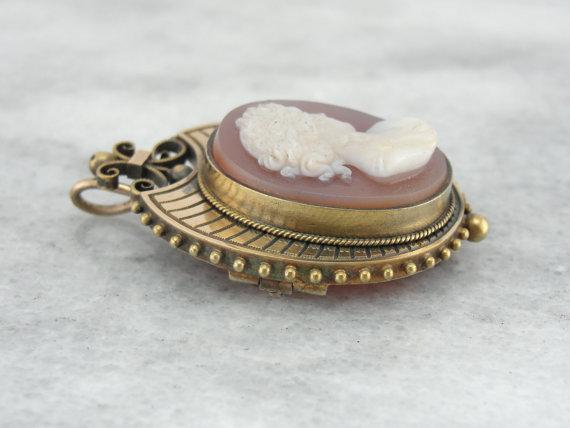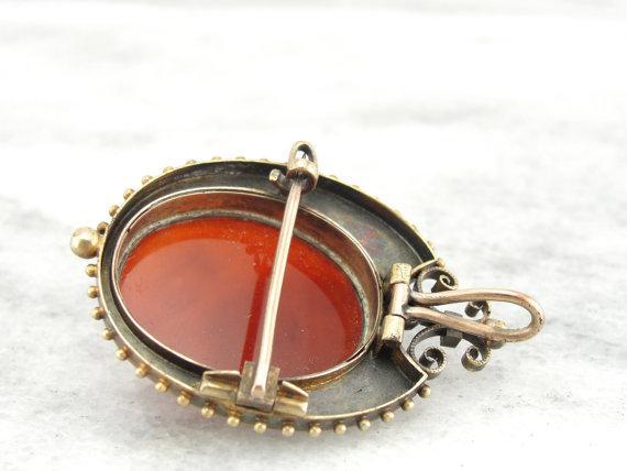 This antique brooch has a rosy warm glow and plenty of light reflected in the unusual, radiant design. The cameo itself has similar tones, carved of sardonyx with a pink tint, the figure at the center is creamy white and very detailed. This can be worn as a pin or a pendant.