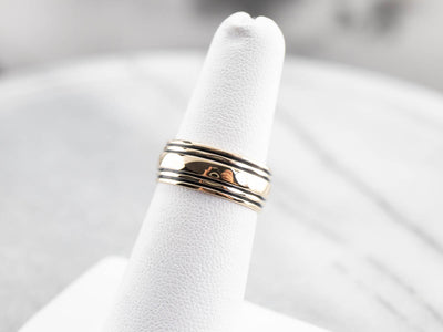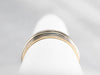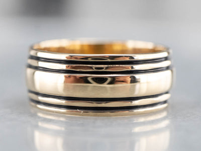 This gold wedding band has a refined design! Blackened grooves create a striped effect, while very subtle faceting adds just a hint of sparkle. The perfect balance between classic and stylish, this ring would also make a great everyday piece!