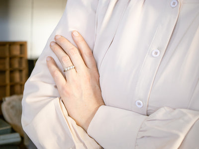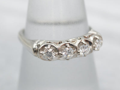 Sophisticated, classy, and completely luscious! This white gold band is of the highest quality, set with some gorgeous diamonds. This beautiful band is set with four bright diamonds on the top, bringing sparkle and light into this pretty vintage piece.