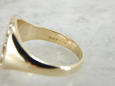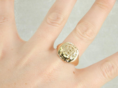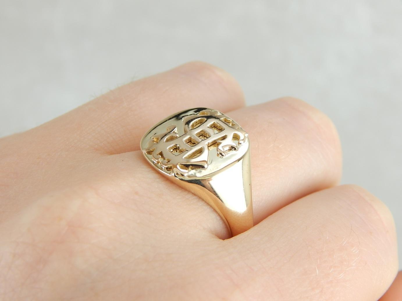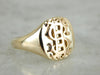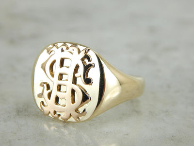 Metal: 14K Yellow Gold Top Measurements: 15 x 14 mm, Cushion Shape Monogram: "SH" (Or other Symbol?) in Old English Size: 11.25 Marks: "B&F 14K" Stamped on the inside band