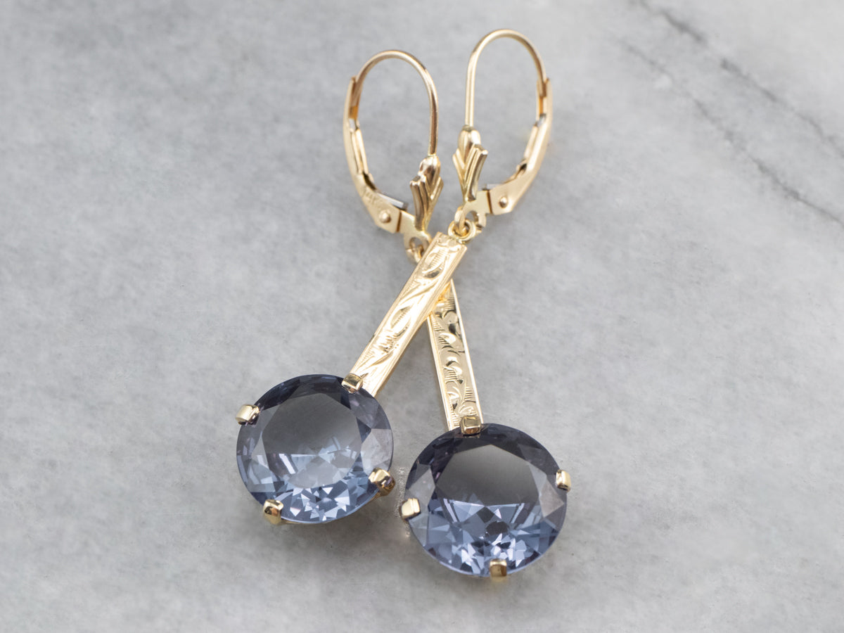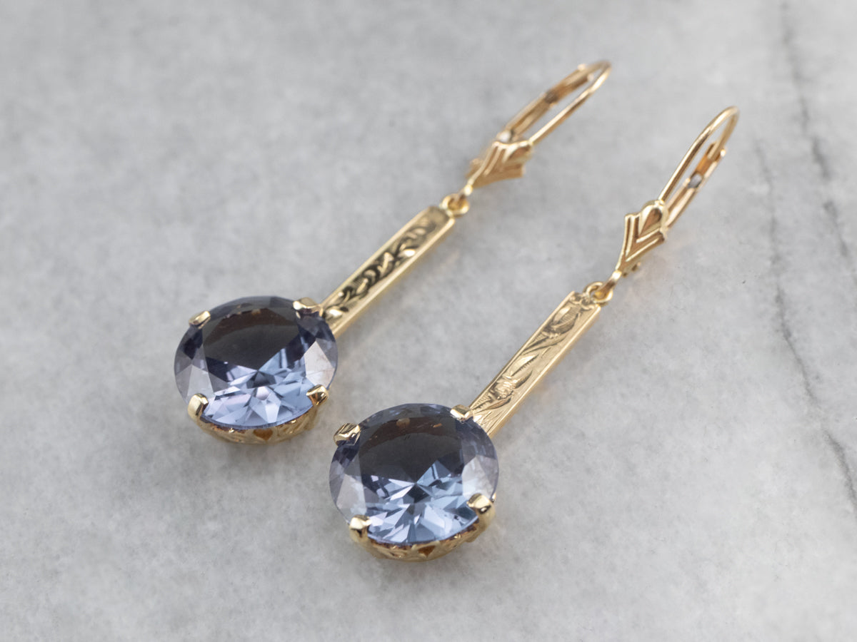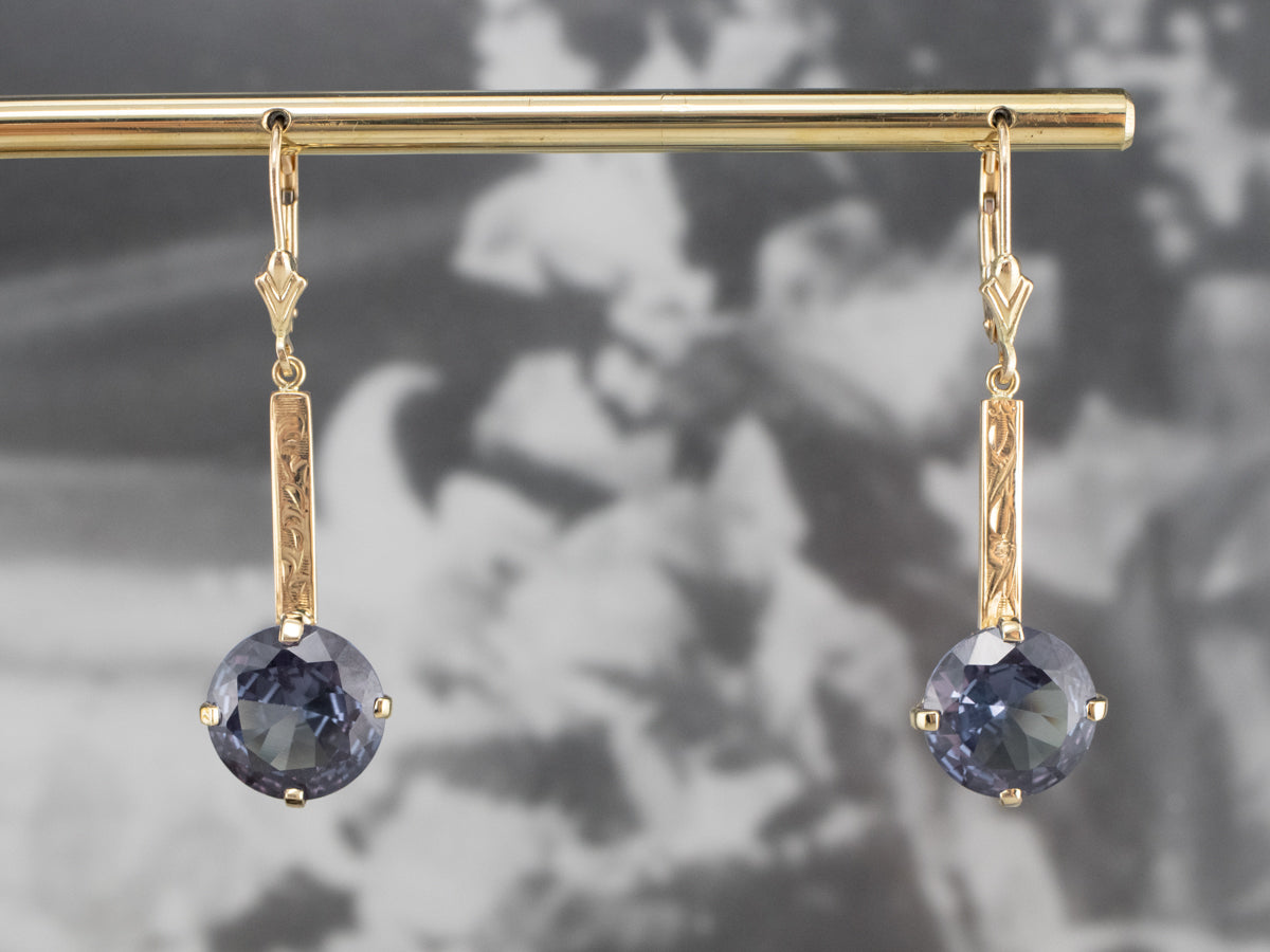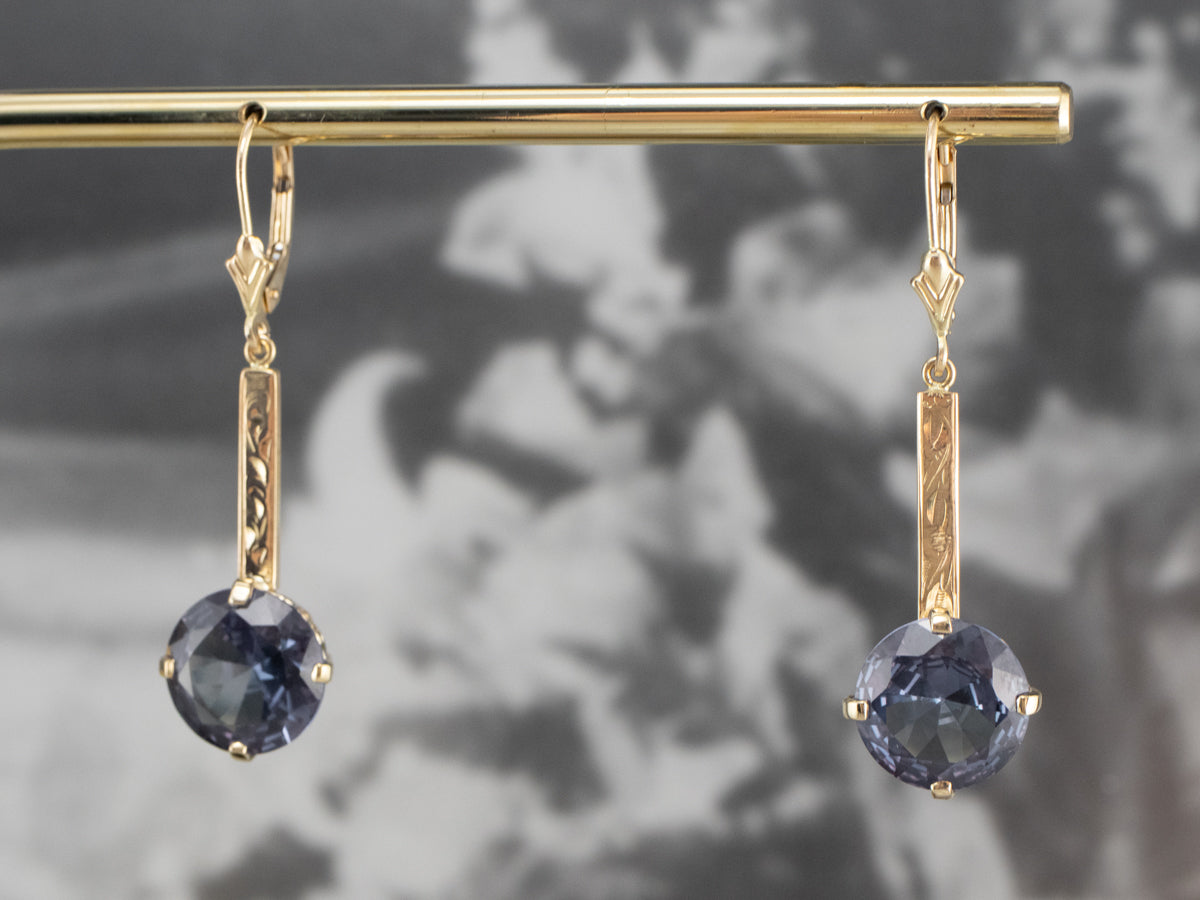 Romantic and chic! These one-of-a-kind drop earrings feature engraved repurposed antique yellow gold bars. A filigree, polished head combines with four structural prongs to hold a lovely center stone of synthetic alexandrite. The prongs both secure and frame the stone, letting plenty of light to shine through. Synthetic alexandrite is a color-changing stone and will reflect shades of regal purple to a teal green-blue depending on the light that hits the stone.
