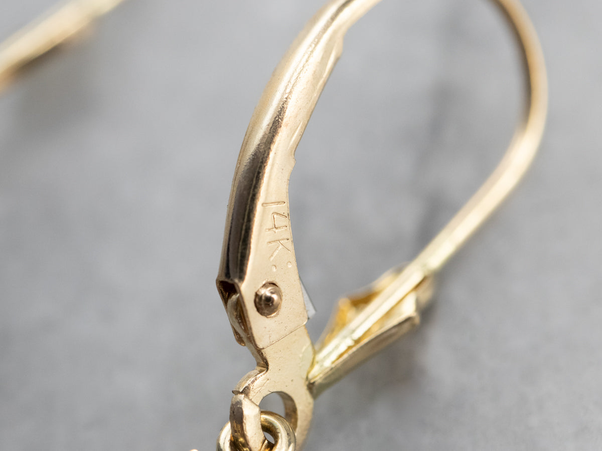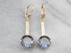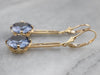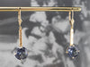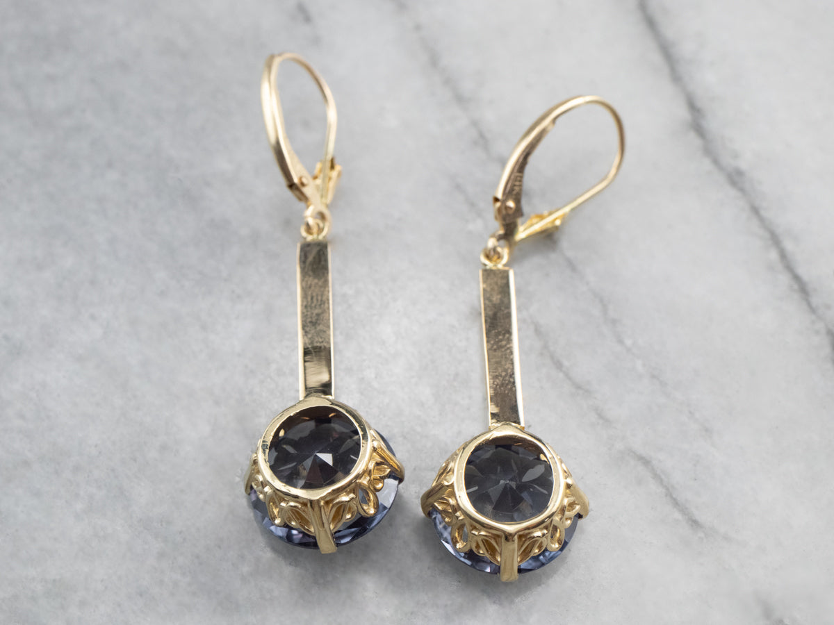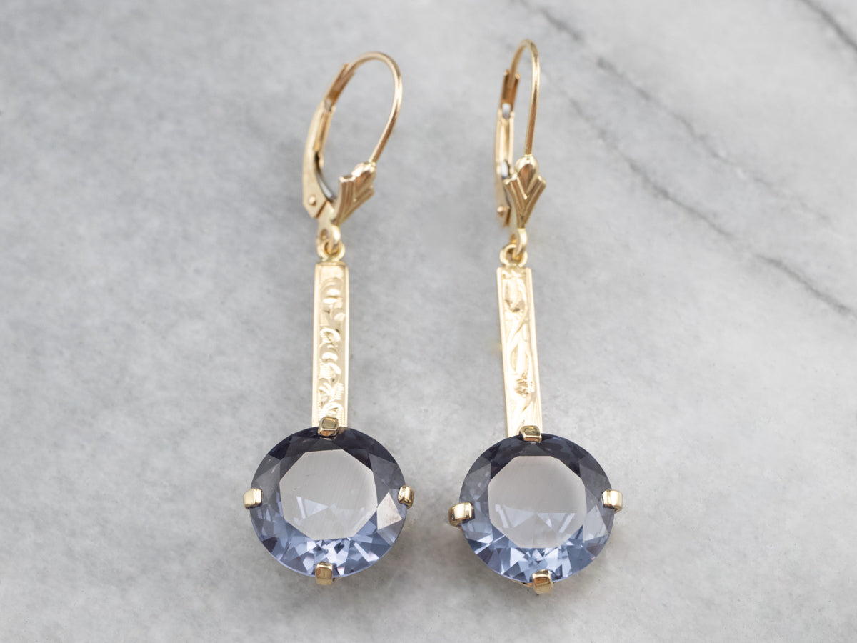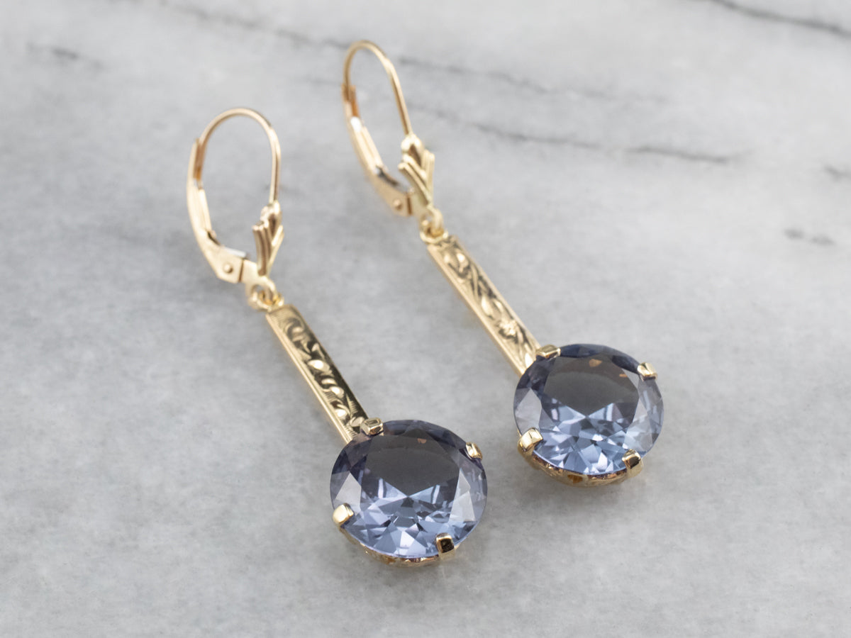 Romantic and chic! These one-of-a-kind drop earrings feature engraved repurposed antique yellow gold bars. A filigree, polished head combines with four structural prongs to hold a lovely center stone of synthetic alexandrite. The prongs both secure and frame the stone, letting plenty of light to shine through. Synthetic alexandrite is a color-changing stone and will reflect shades of regal purple to a teal green-blue depending on the light that hits the stone.
