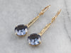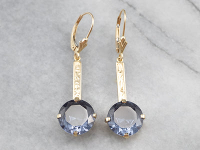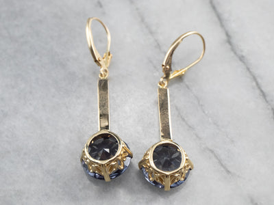 Metal: 14K Yellow Gold Gem: 2 Synthetic Alexandrite totaling 9.86 Carats Gem Measurements: 11.2 mm, Round Earrings Length: 43 mm Earrings Width: 12 mm Marks: "14K" Stamped on the Findings