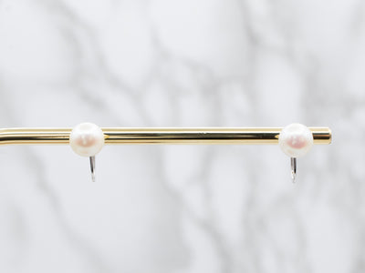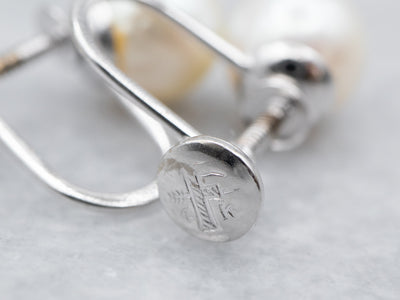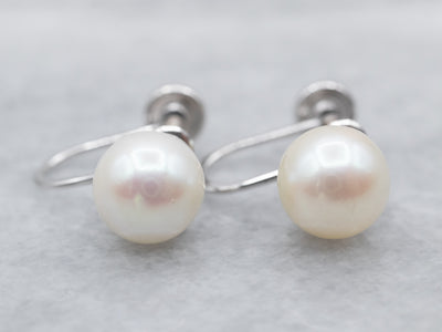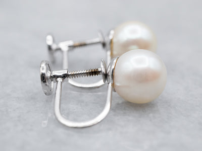 These earrings are lovely and easy to wear, whether your ears are pierced or not! The screw backs are fine 14-karat white gold, comfortable and secure. White cultured pearls grace the front and are the perfect piece to transition easily from day to night.
