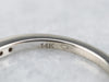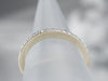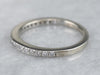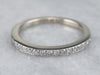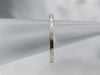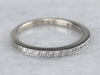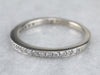This white gold diamond band is simple but beautiful, it has a flat top and geometric, straight-line sides. The thin profile makes this band a wonderful compliment to an antique engagement ring; or a pretty, simple, and sparkly band to wear alone!