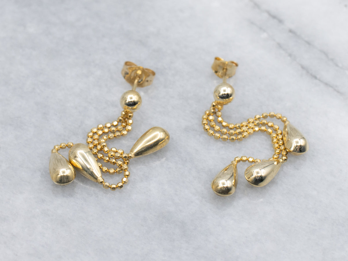 Elegant teardrop silhouettes suspended from delicate triple-beaded chains create a refined statement piece. These gold dangle earrings blend timeless sophistication with contemporary design, offering graceful movement with every wear. Perfect for elevating both everyday elegance and special occasions, they showcase meticulous craftsmanship and luxurious appeal.