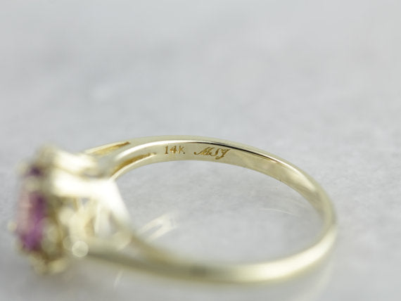 This pink sapphire anniversary ring has a luscious pink stone which is a Ceylon sapphire, a beautiful and rare gemstone that borders on ruby in hue. Old Ceylon, now Sri Lanka, is the source of some of the finest sapphire material in the world, and this dusty rose-pink sapphire is no exception!