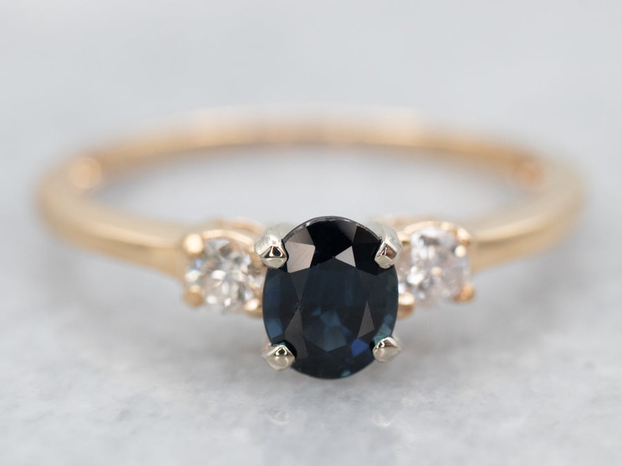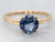 This sapphire halo ring has an incredible Ceylon sapphire gleams with an incredible cobalt and purple hue. Mined and faceted in Sri Lanka, this lovely blue sapphire is a wonderful complement to the rich green gold of its setting.