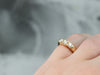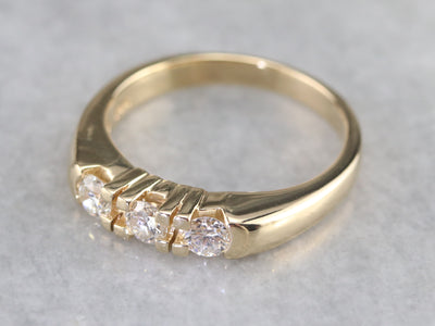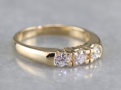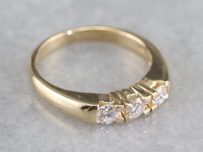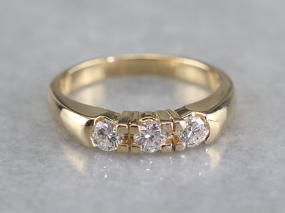 This three diamond wedding ring is an absolute classic! The gold has a beautiful, rich warmth that pairs beautiful with the bright and sparkling diamonds. Traditionally, each gem represents the past, present, and future, making this ring the perfect romantic symbol.
