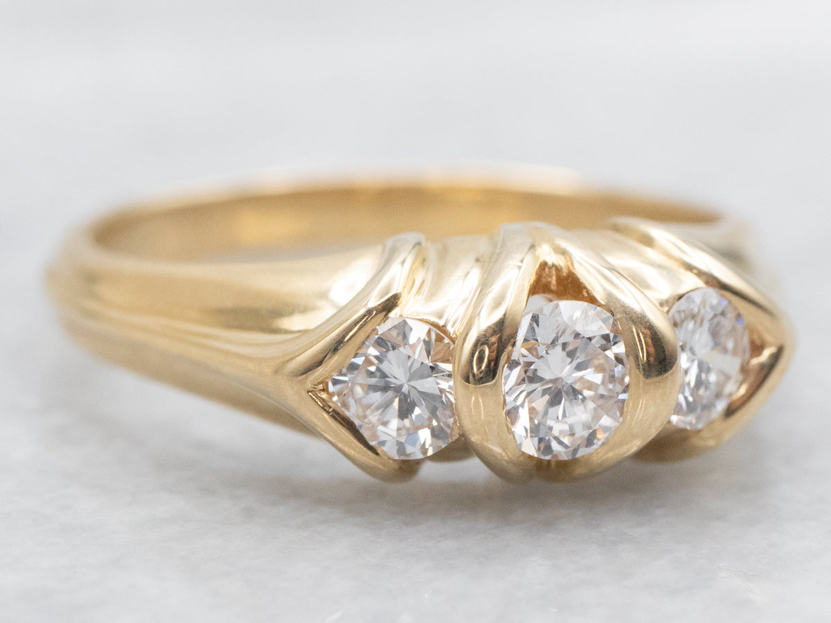 Metal: 14K Yellow Gold Gem: 3 Diamonds totaling .60 Carats, VS-SI in Clarity, G in Color Gem Measurements: 4.1 mm, Round Ring Size: 7.25 Marks: "14K MD" Stamped on the inside band