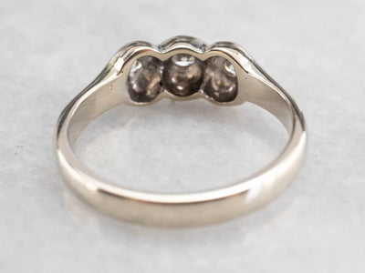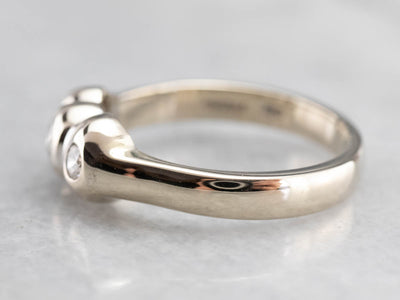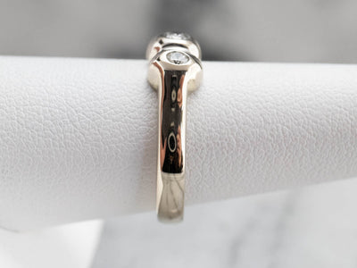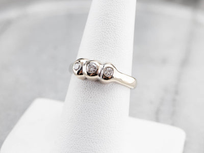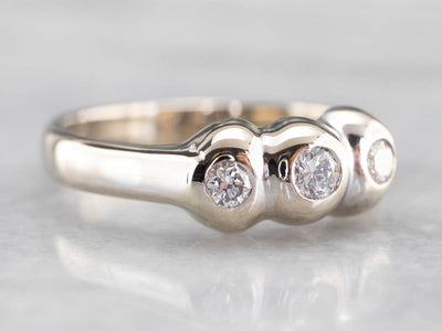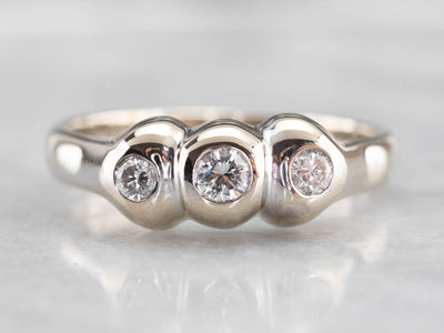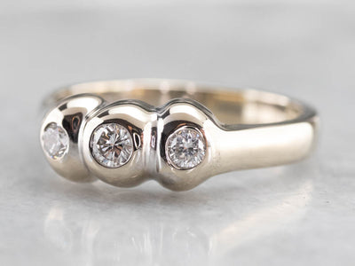 Contemporary and modernist, this piece has simple, flowing bezel curves and utterly simplistic design that brings out the best in the three diamonds. The sleek setting is comfortable on the hand and the shank has a nice substantial weight. Completely surrounded and protected by bezels, these diamonds have a radiance that is unique, unimpeded by a traditional mounting. We particularly love how low the ring sits to the finger, making it easy and comfortable to wear.
