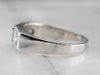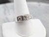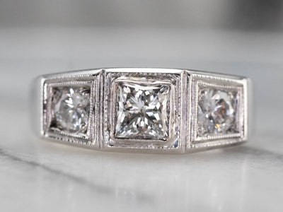 This Retro era three stone diamond ring has a fabulous structure and design. Bold architectural shoulders transition into a rectangular head holding three exceptional diamonds. The band design sits comfortably on the finger, substantial-looking without being too heavy.