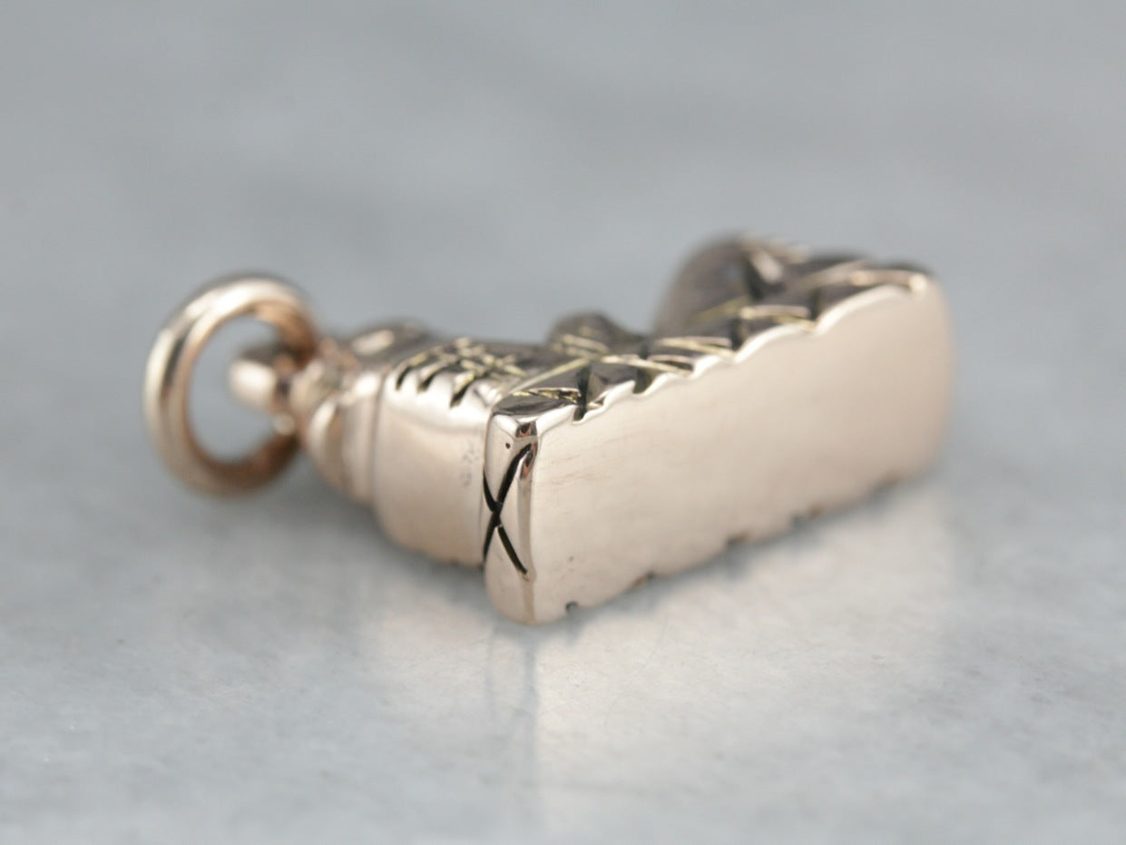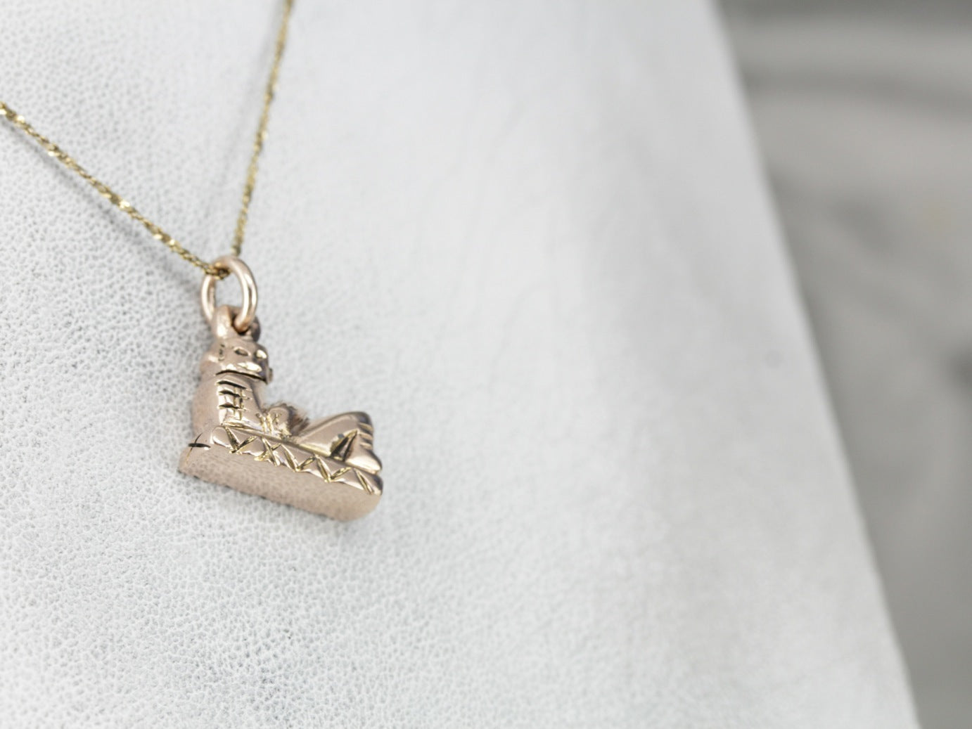 This fellow is expertly crafted of solid rose gold. It is a depiction of Chacmool. Chacmool is the term used to refer to a particular form of pre-Columbian Mesoamerican sculpture depicting a reclining figure with its head facing 90 degrees from the front, supporting itself on its elbows and supporting a bowl or a disk upon its stomach.