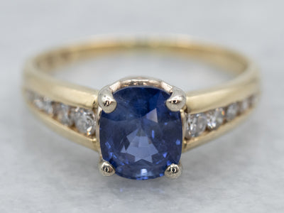 This timeless vintage mounting is classic and simple and is set with a lovely cobalt blue fine Ceylon Sapphire, accented on each side by a channel set row of graduated diamonds. The warmth of the yellow gold is an amazing contrast with the deep color of the sapphire, and really brings out the bright flashes of royal blue and cobalt. This is the ideal coloring for sapphires; and the closer you get to this medium-deep blue, vibrant and really saturated, almost cobalt blue (also known as "cornflower" blue); the more valuable and rare the stones get. The cushiony-oval cutting on this stone really makes the color pop and sparkle in the light, and still remains a beautiful shape and size to wear every day.