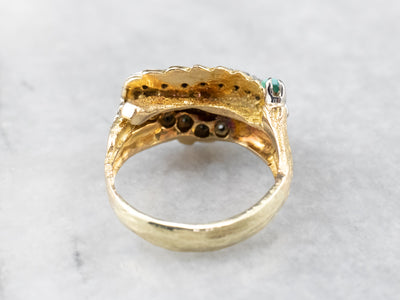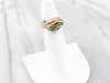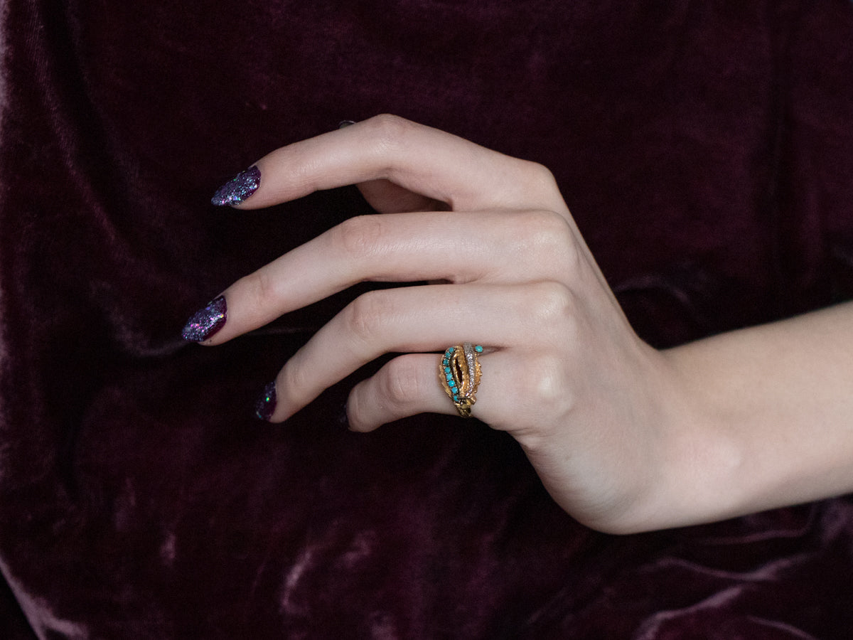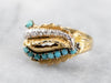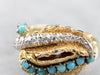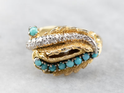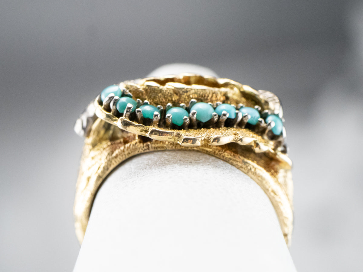 This gorgeous 18 karat gold, turquoise, and diamond ring is a wonderful statement piece! We've given this a professional polish but left the original patina on the top to create the desired shadow effect around these lovely gemstones and metalwork.