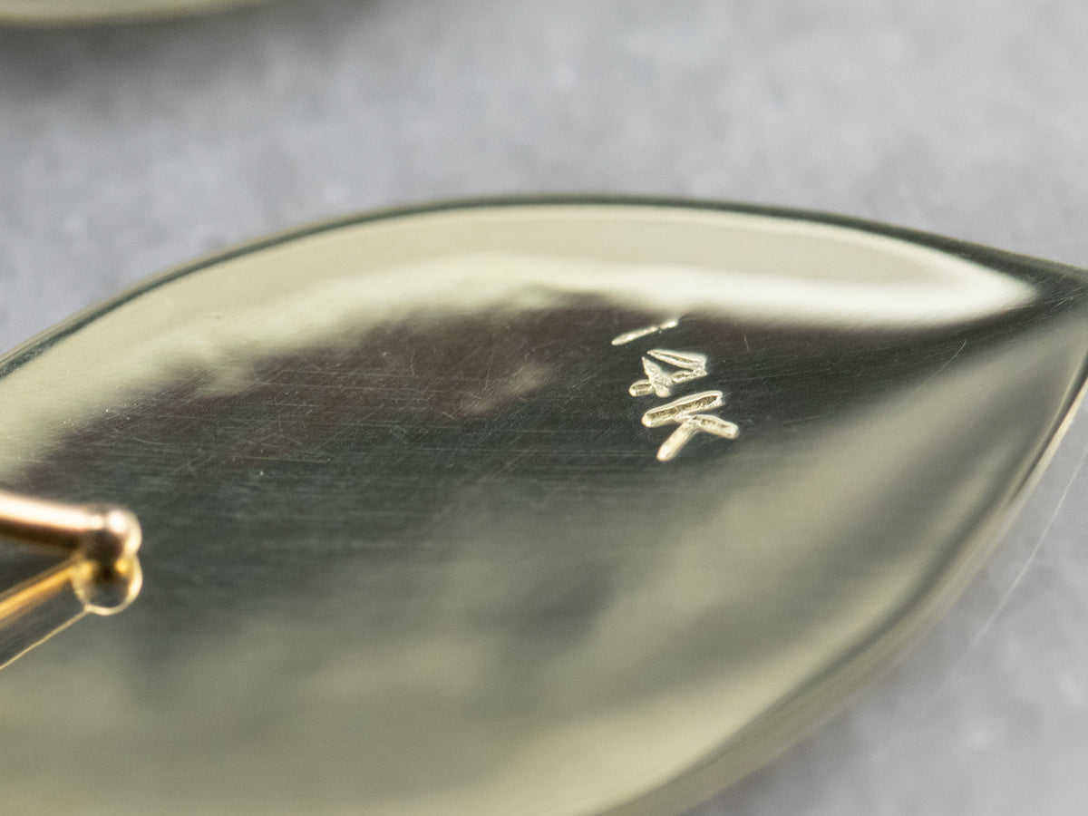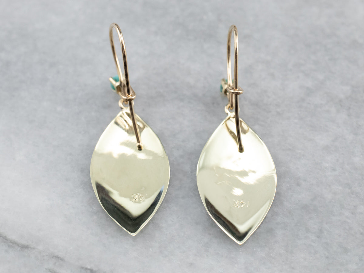 These beautiful earrings were handcrafted by our studio, using pieces of antique cufflinks! The handsome, sophisticated drops are crafted of 14K green gold. Turquoise accents add a special touch to these fantastic shining drops!