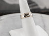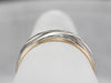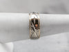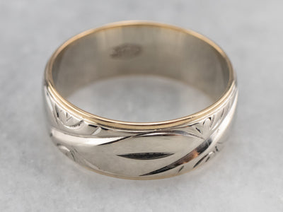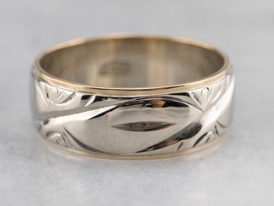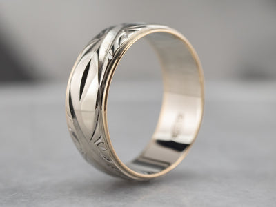 This patterned band has fantastic dimension thanks to the swirling, etched patterns that dance across its surface. The design uses both white and yellow gold for versatility and a touch of modern flair. This ring would make a unique wedding band!
