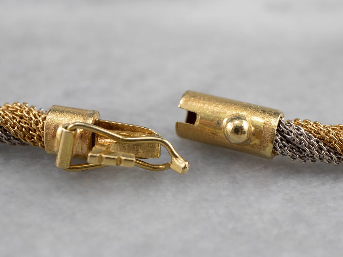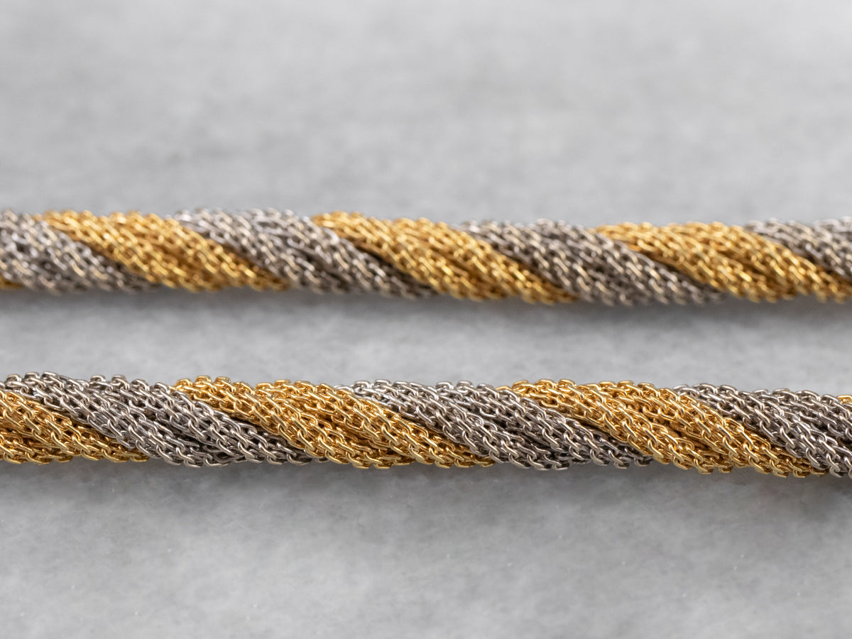 This unique chain necklace is so luxurious! Mesh chains of 18k white and yellow gold twist in an elegant rope giving the necklace a stylish texture and finish. Impressive, yet versatile, this necklace is easy to pair with a variety of looks!