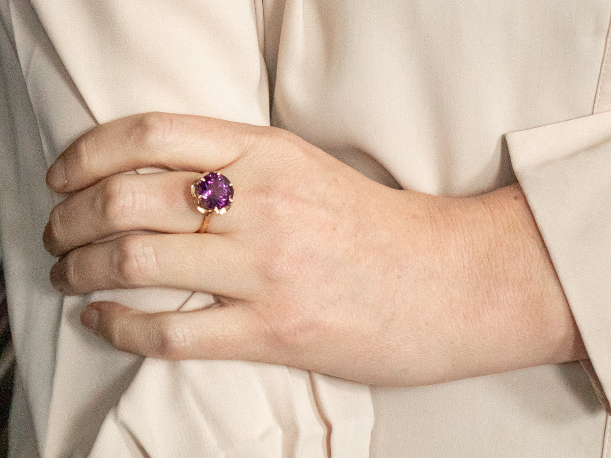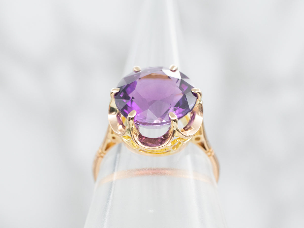 This two tone ring exudes elegance and sophistication. Crafted in yellow and rose gold, this ring showcases a stunning round cut amethyst, making it a captivating and timeless piece of jewelry. With its solitaire design, this ring is perfect for a classic and refined look!