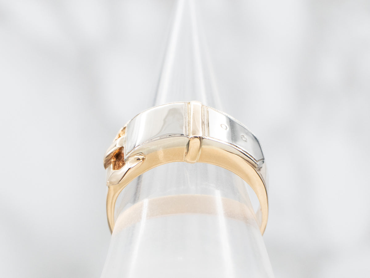 Add a touch of elegance to your jewelry collection with this ring! Crafted from yellow and white gold, this unique piece features a buckle design symbolizing strength and unity. Perfect for everyday wear or special occasions!
