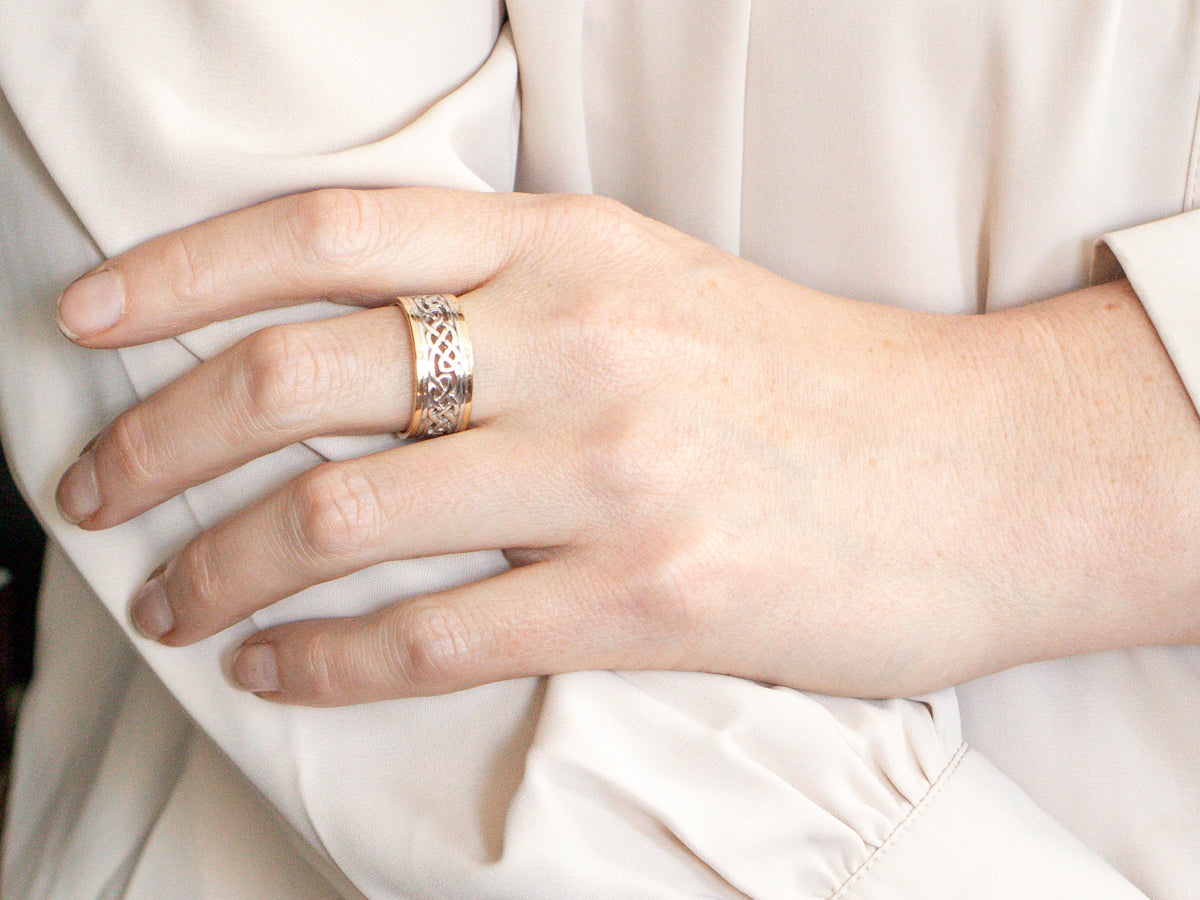 Introducing this unique wedding band! With yellow gold edges and a delicate openwork Celtic knot design in white gold, this band is the perfect symbol of unity and love. Get ready to say "I do" with a touch of Celtic charm and elegance!
