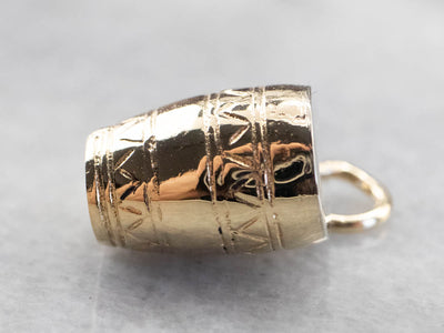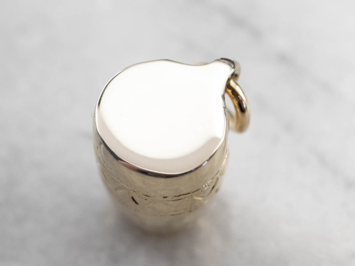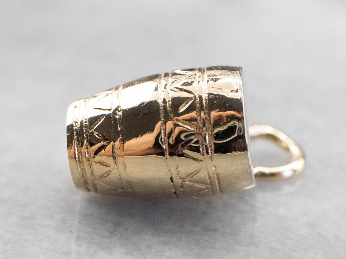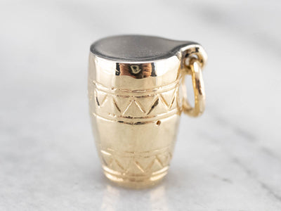 This conga drum charm is engraved with patterns that bring it to life! Perfect for any music lover, this piece is crafted from two tones of 14 karat gold.