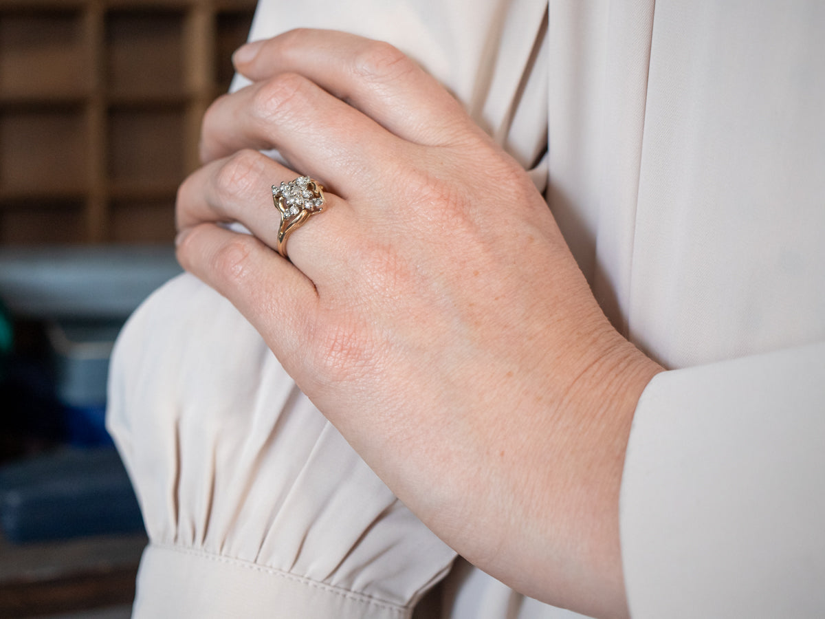 This striking two-tone ring is crafted from yellow and white gold, featuring a dazzling diamond cluster. The elegant combination of yellow and white gold makes for an eye-catching design that will turn heads.
