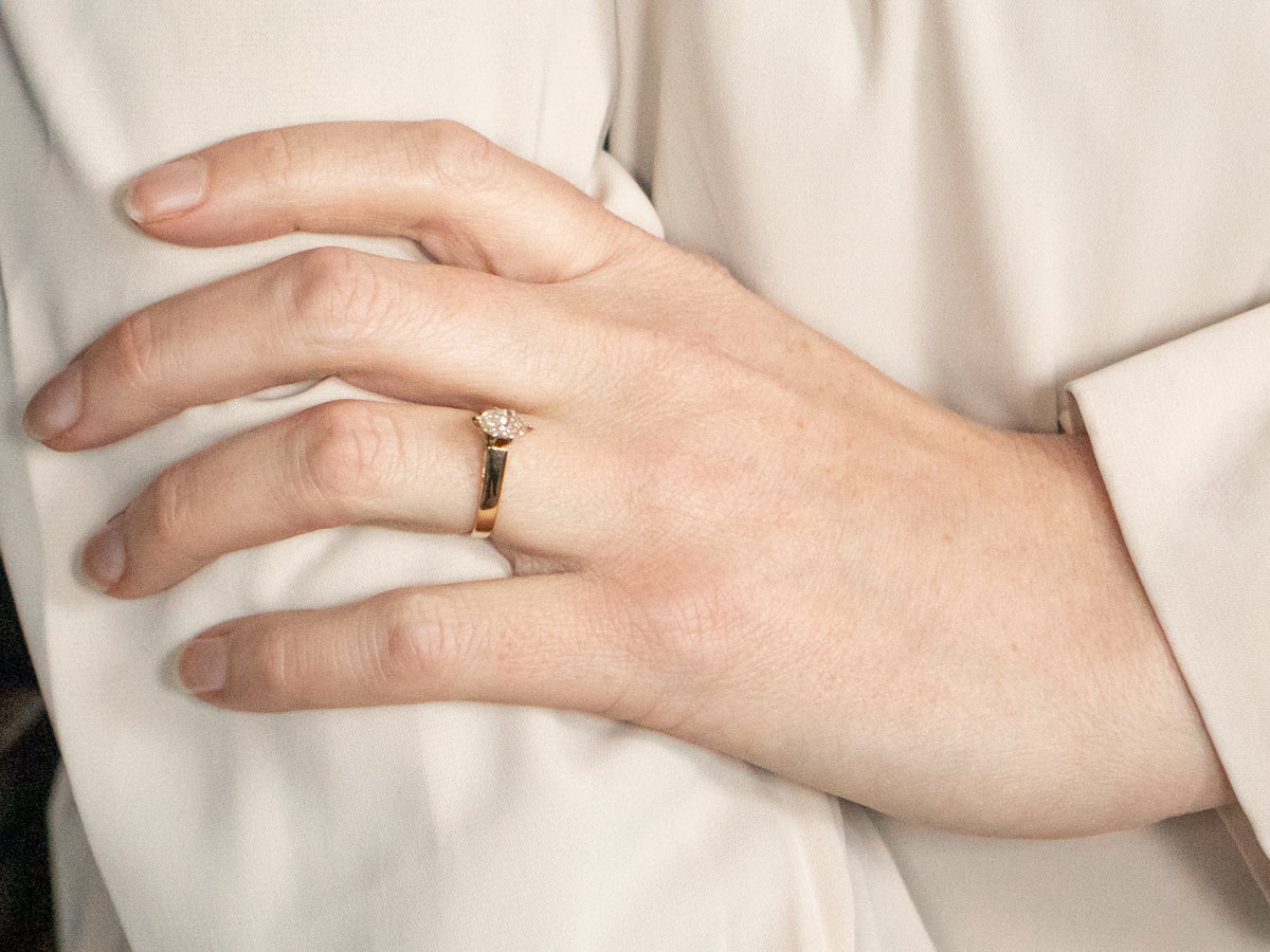 This elegant two tone ring combines the classic beauty of yellow gold with the modern touch of a white gold head. The marquise cut diamond creates a stunning solitaire that will stand out on any finger. Perfect for those looking for a timeless yet unique engagement ring!