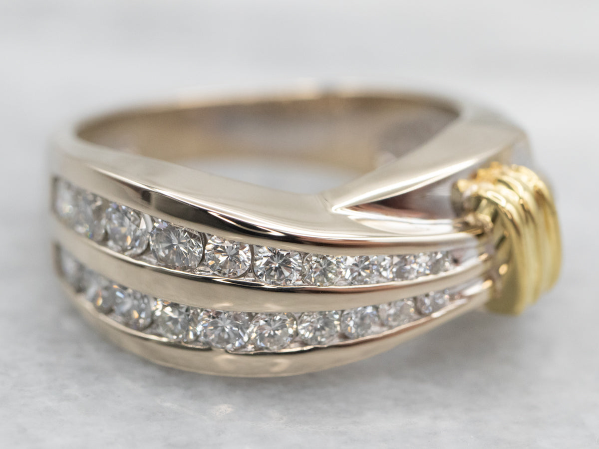 Two rows of diamonds glitter across this gorgeous ring! Crafted of both white and yellow gold, this interesting ring will match any outfit!