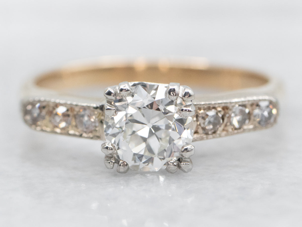 Metal: 14K Yellow and White Gold Gem: European Cut Diamond .78 Carats, VVS2 in Clarity, I in Color Gem Measurements: 5.5 mm, Round Accents: 6 Diamonds totaling .10 Carats, SI in Clarity, H-I in Color Ring Size: 5.75 Marks: "14K" Stamped on the inside band