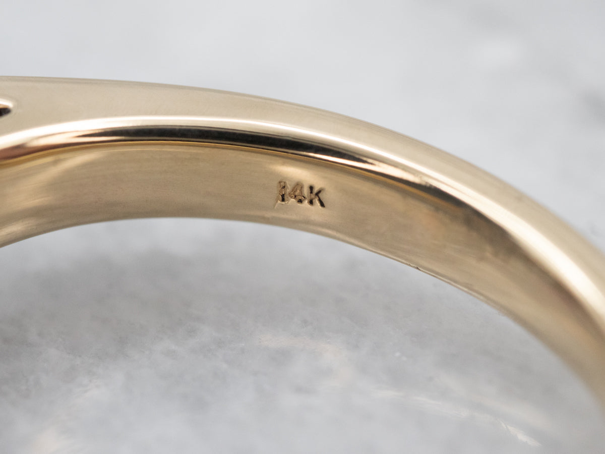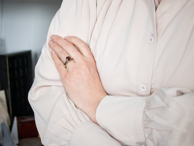 This ring features a simple and classically designed mounting, with a little bit of a twist! The structural pattern of the shoulders lends a sense of light and grace to the mounting. Shaped in a perfect round cut, the deep red burgundy garnet in the center adds a lovely pop of color and also an interesting shape to a simple ring!