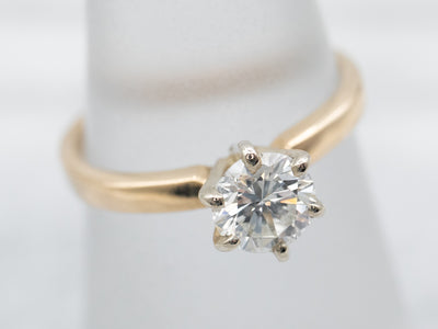 This engagement ring is simple and traditional, with a gently tapered shank and shoulders, and a perfectly balanced silhouette. A sleek six-prong white gold head holds the diamond and gently transitions into a sleek and beautifully polished yellow gold shank. Timeless and elegant!
