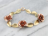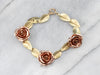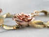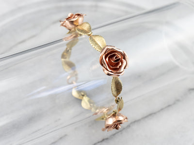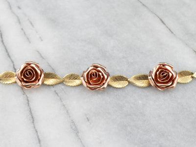 Expertly crafted, perfectly polished, this vintage piece is timeless and romantic. This floral link bracelet is from the Retro era crafted of fine rose and green gold with plenty of detail! Easy to wear alone or layered with other vintage pieces, this bracelet is perfect for a night out on the town or a day at the office.