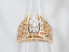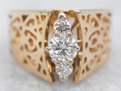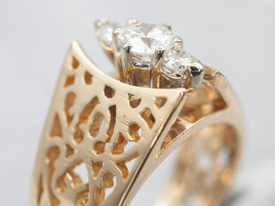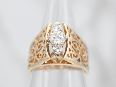 This stunning two-tone 14-karat gold ring features a peaked openwork design set with dazzling diamonds, perfectly encircling your finger and glimmering in the light. Crafted from two interlocking silver and gold tones, this ring is sure to make a statement.