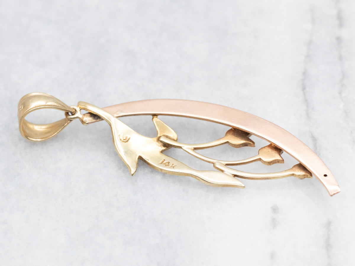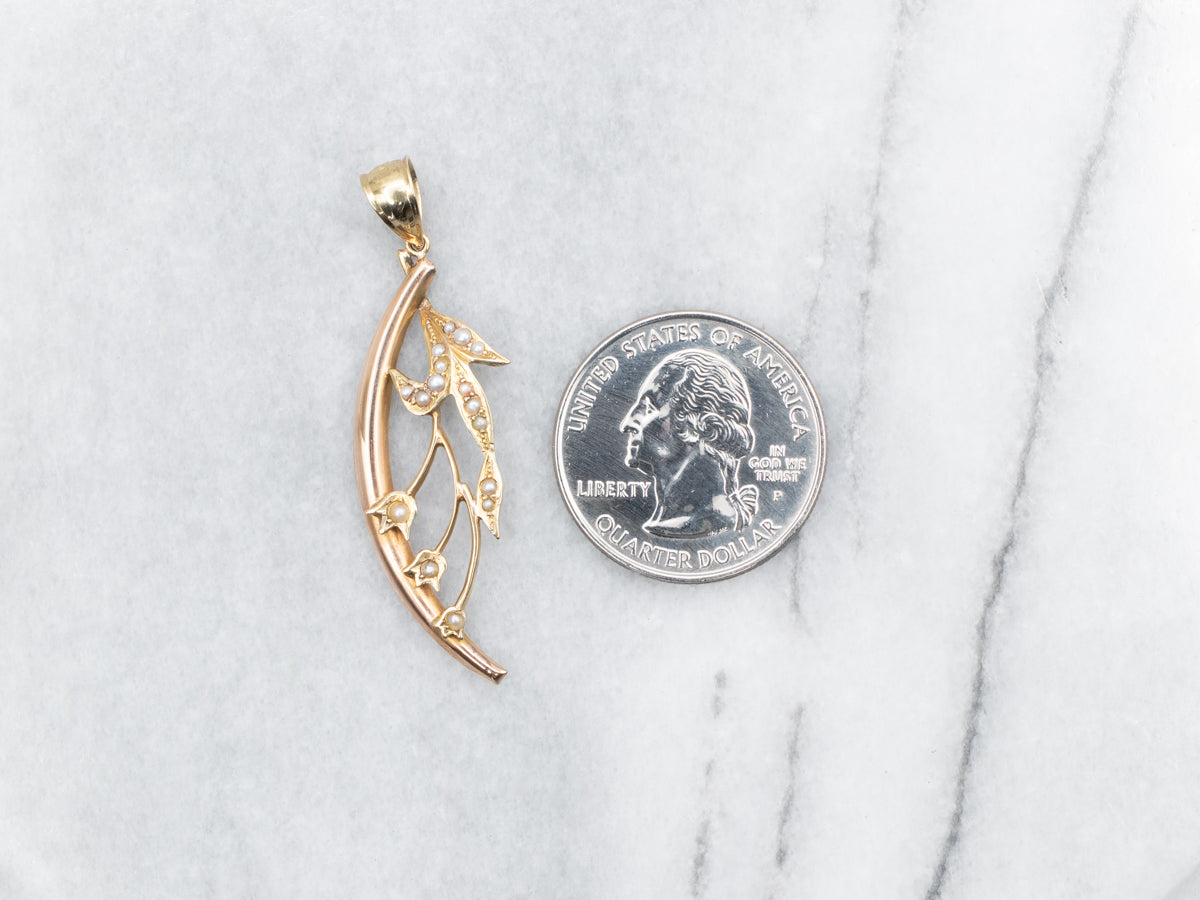 Expertly designed in the Victorian era, this pendant features a beautiful contrast between warm rose gold and creamy white seed pearls. According to the Language of Flowers from that time period, the Lily of the Valley symbolizes a return to happiness. Recently updated with a new yellow gold bail, this antique piece can now be worn and enjoyed once again.