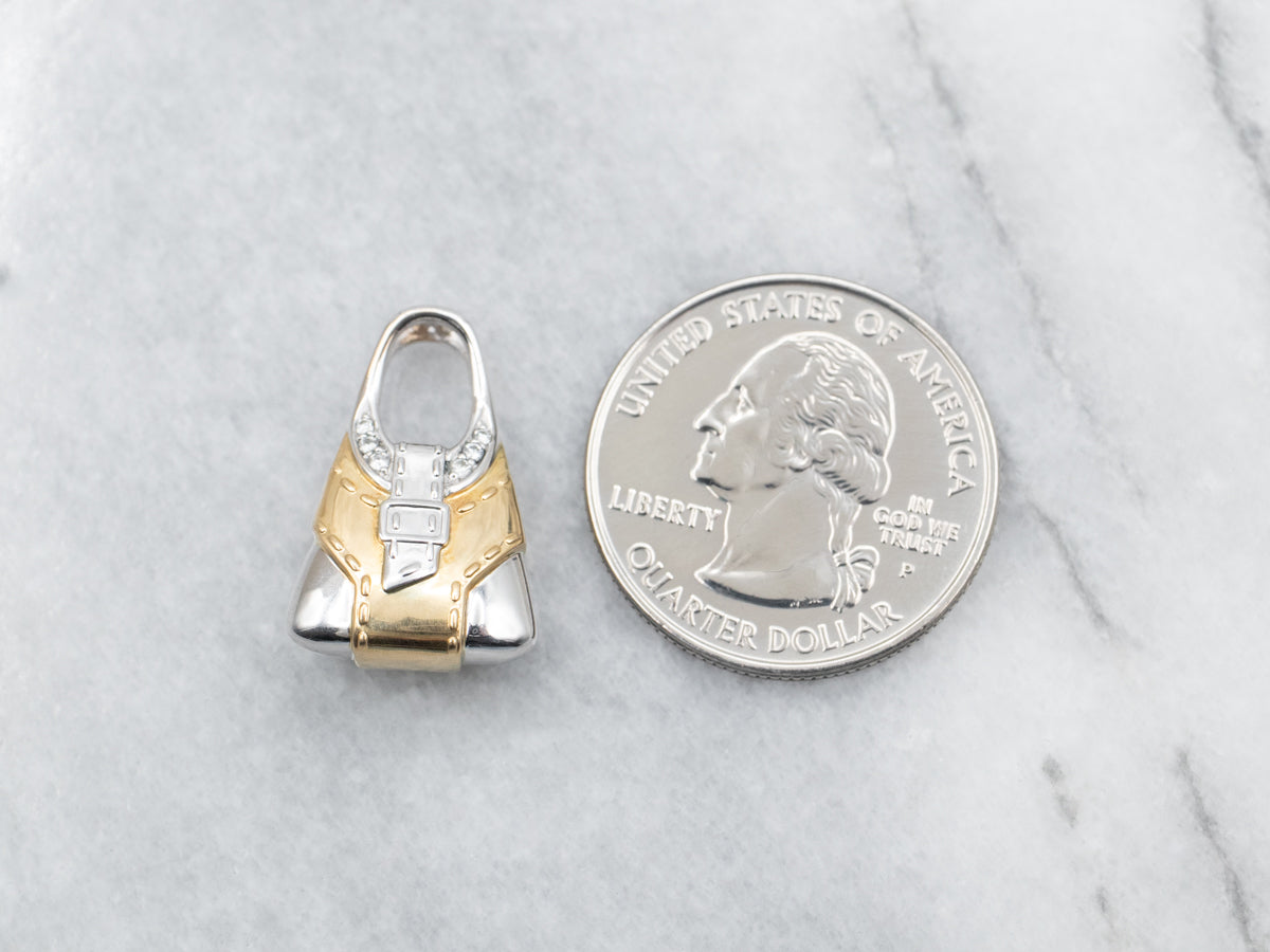 Elevate your style game with this two-tone yellow and white gold handbag pendant adorned with brilliant diamond accents - just the thing for spicing up any ensemble! Perfect for adding a touch of glam to your everyday or classing up special occasions.