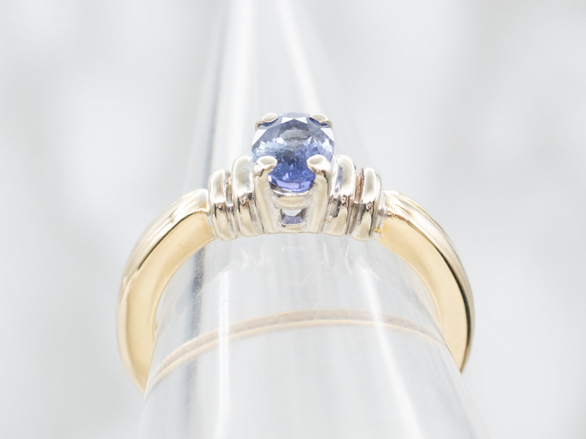 Metal: 14K Yellow and White Gold Gem: Sapphire 1.05 Carats Gem Measurements: 4.7 x 6.8 mm, Oval Ring Size: 6.25 Marks: "S 14K" Stamped on the inside band
