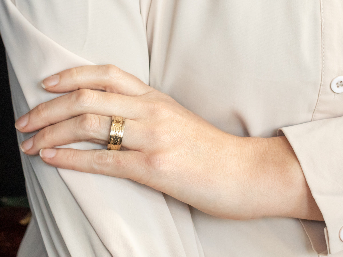 This patterned band would make a great wedding ring or everyday statement piece! A deeply carved design of woven knot patterns adorns the yellow gold, while a contrasting border of white gold keeps the silhouette sleek.