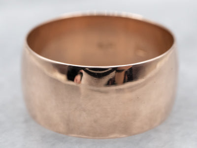 Simple and subtle, this wide antique band features a low dome on top and a beautiful, soft polish. The profile and finish are completely undecorated, giving this piece a nice profile for a man or a woman.