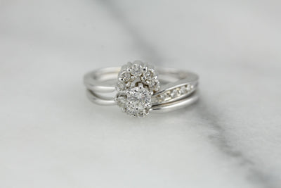 Classic and simple, the pretty white gold wedding band was designed specifically to sit alongside this beautiful halo style engagement ring. The curved style allows it to sit up close, and the bright diamonds bring even more sparkle to the beautiful center stone.