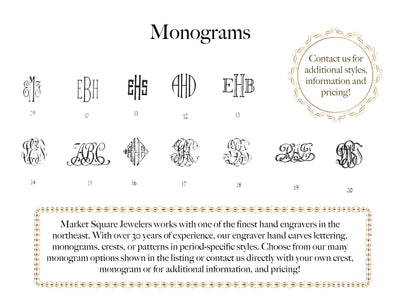 Market Square Jewelers works with one of the finest hand engravers in the northeast. With over 30 years of experience, our engraver hand carves lettering, monograms, crests, or patterns in period-specific styles. Choose from our many monogram options shown in the listing or contact us directly with your own crest, monogram, or for additional information, and pricing!