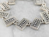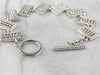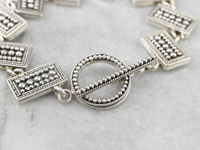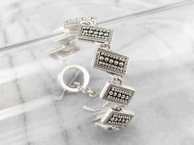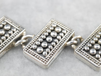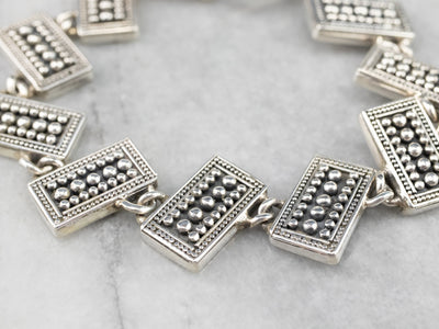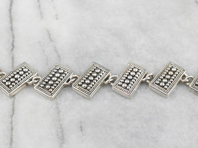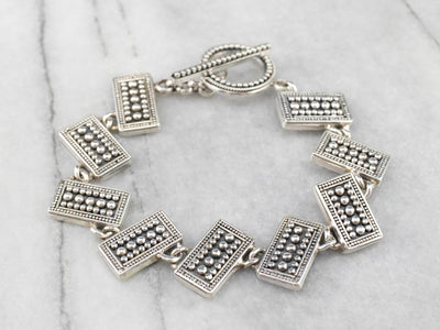 Timeless and yet modern! This sterling silver bracelet will look lovely worn alone or stacked with other pieces. The links are substantial rectangle links, with a textured metal bead pattern. This would make a great everyday bracelet to wear with a suit or a cocktail dress!