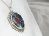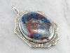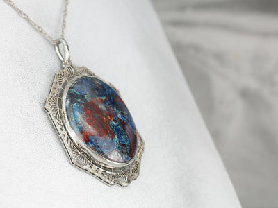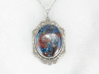 The Art Deco details in polished white gold filigree that decorate the frame of this upcycled pendant are the perfect, subtle accent! We've mounted the center with an immaculately polished cabochon of chrysocolla in rich teal brown and blue hues!
