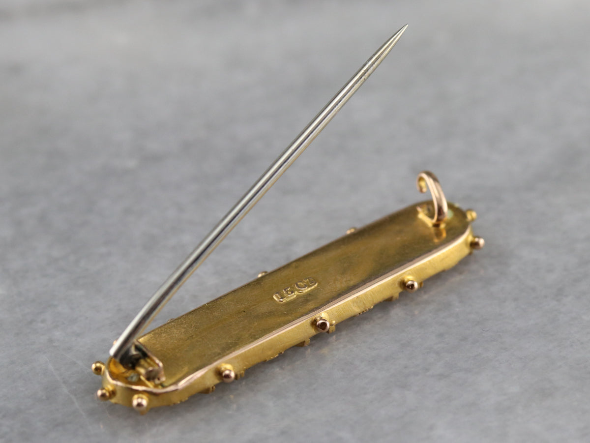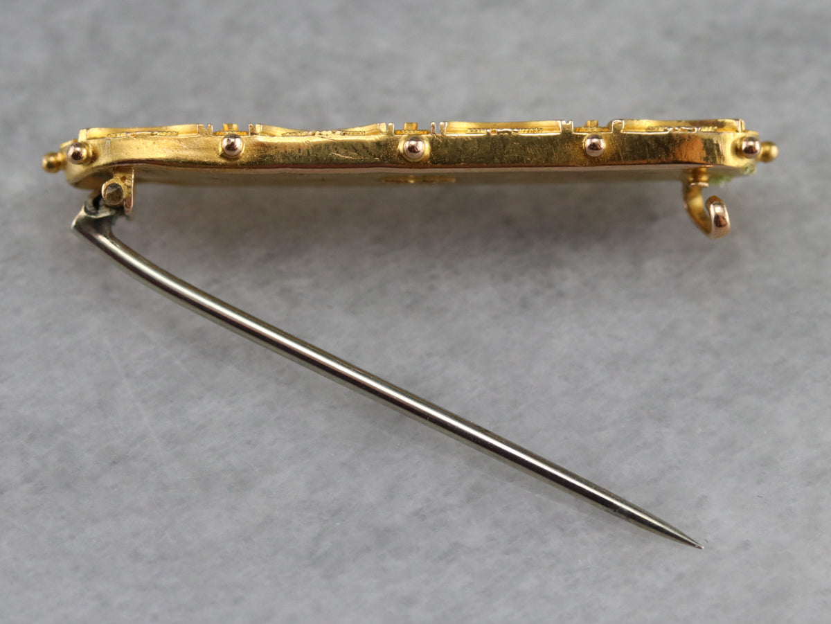 Dating to the late 1800s this beautiful pin is crafted in the Etruscan style. Fantastic milligrain and metalwork detail the classically styled piece. This antique pin is crafted of 15 carat bloomed gold, this term is used for gold jewelry that has been engrossed in a bath of hydrochloric acid, saltpeter and salt and water to give slightly matte texture. In wonderful condition, this antique bar pin ready to wear or gift!