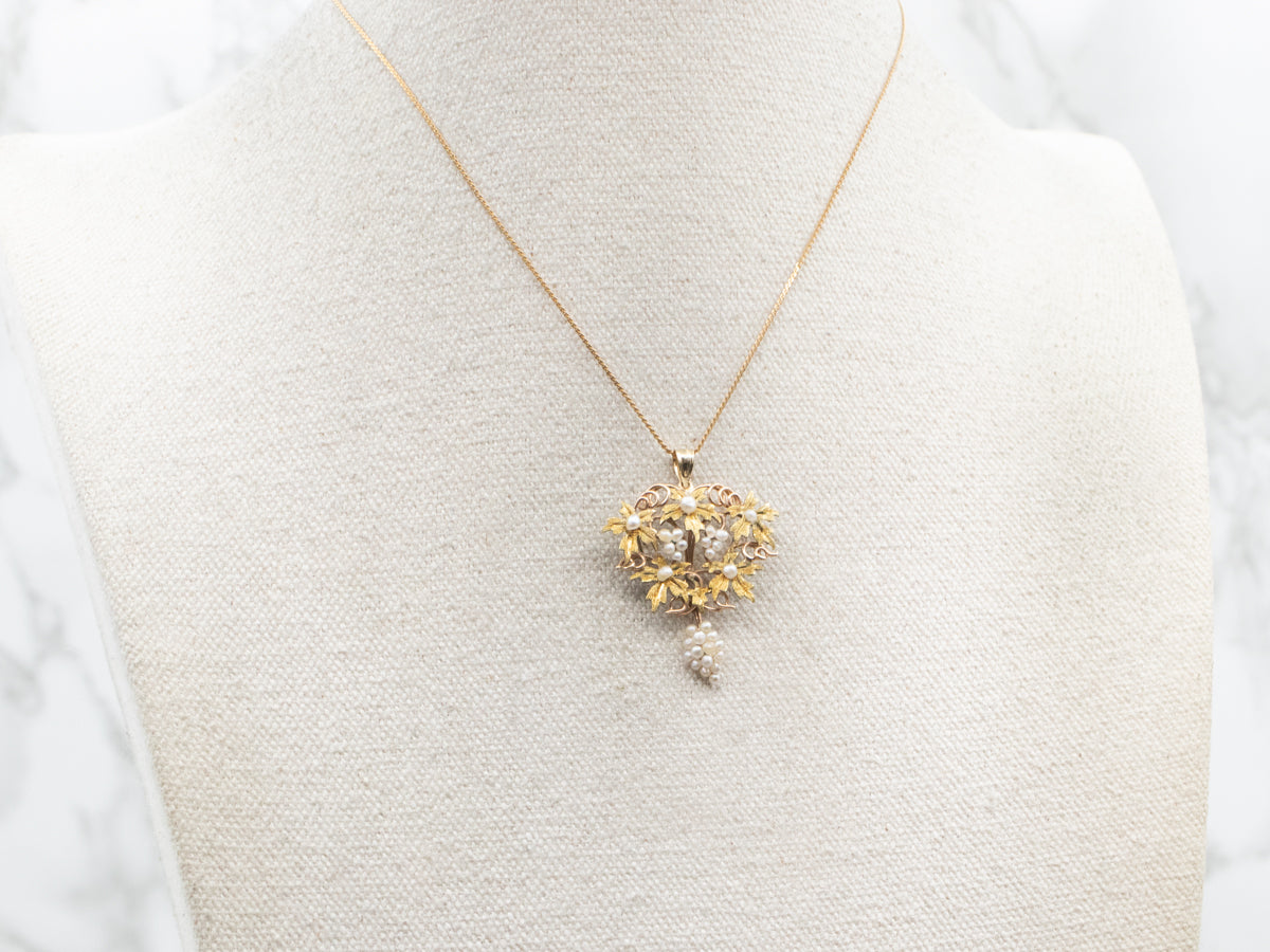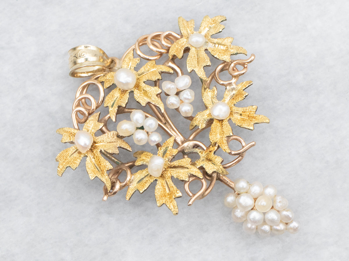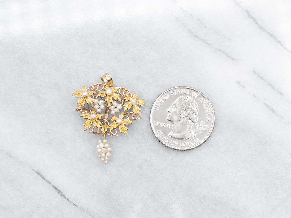 A personal favorite in the shop, this is a beautiful example of Art Nouveau workmanship! The small grape leaves are twisting and natural looking, and the small seed pearls have outstanding luster and a creamy white color.
