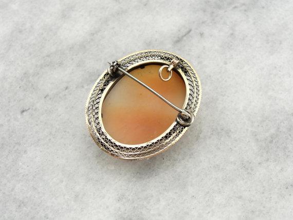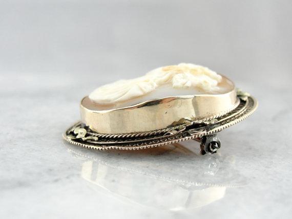 The frame of this antique piece is doubled, two filigree frames attached with engraved green gold leaves. Carved from a medium, rosy brown shell, the lady's portrait is very white and stark; with beautiful flowing lines and flowers adorning her hair and shoulder!