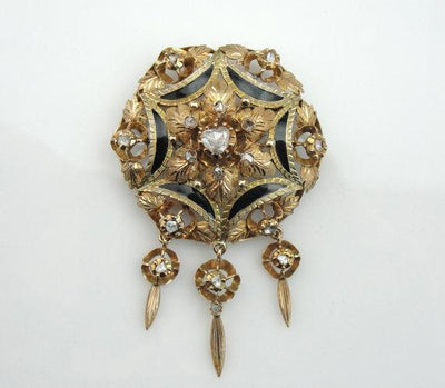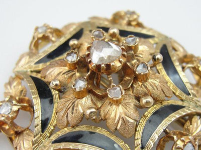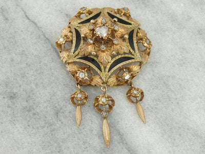 Ornate, natural, and stunning! This antique Victorian brooch is set with rose-cut diamonds and accented with crisp black enamel! The base of the piece is yellow gold, warm and coppery, and crafted with precision and detail. This is a substantial piece with intricate engraving and plenty of milligrain work.