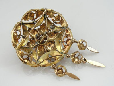 Metal: 18K Rose-Yellow Gold Size: 70mm including tassel, by 42mm wide Stones: 17 Rose Cut Diamonds